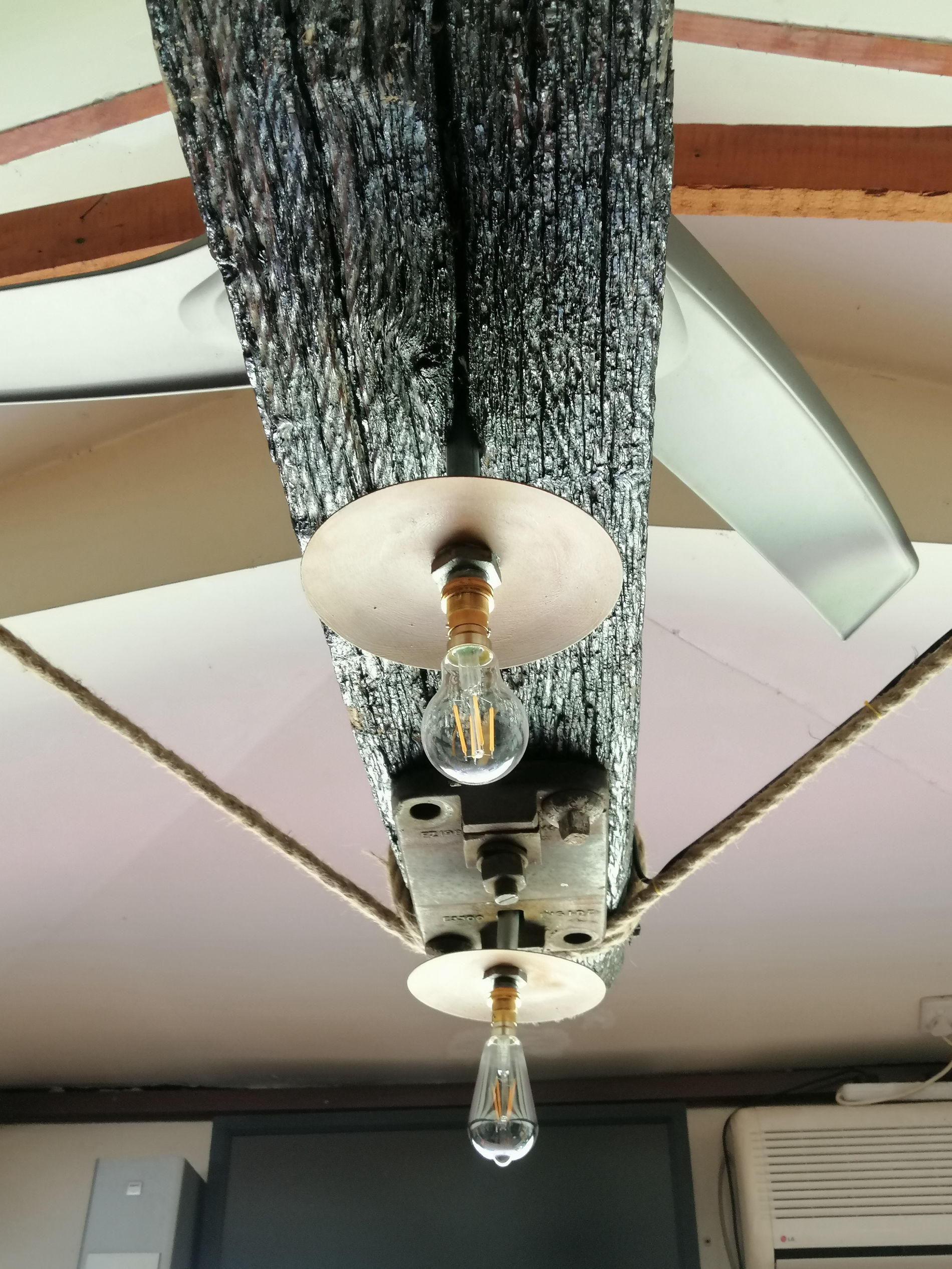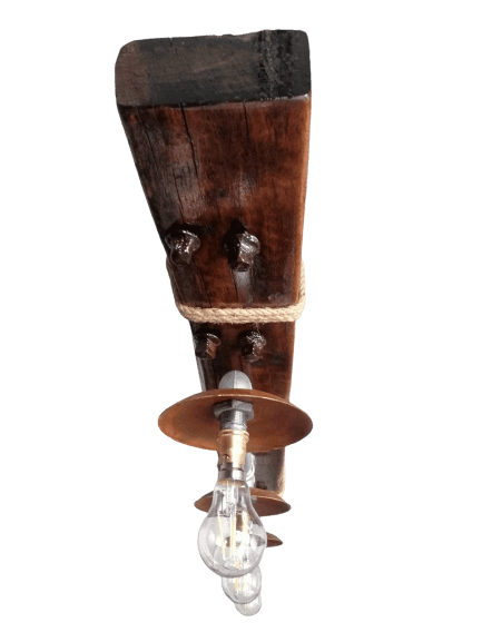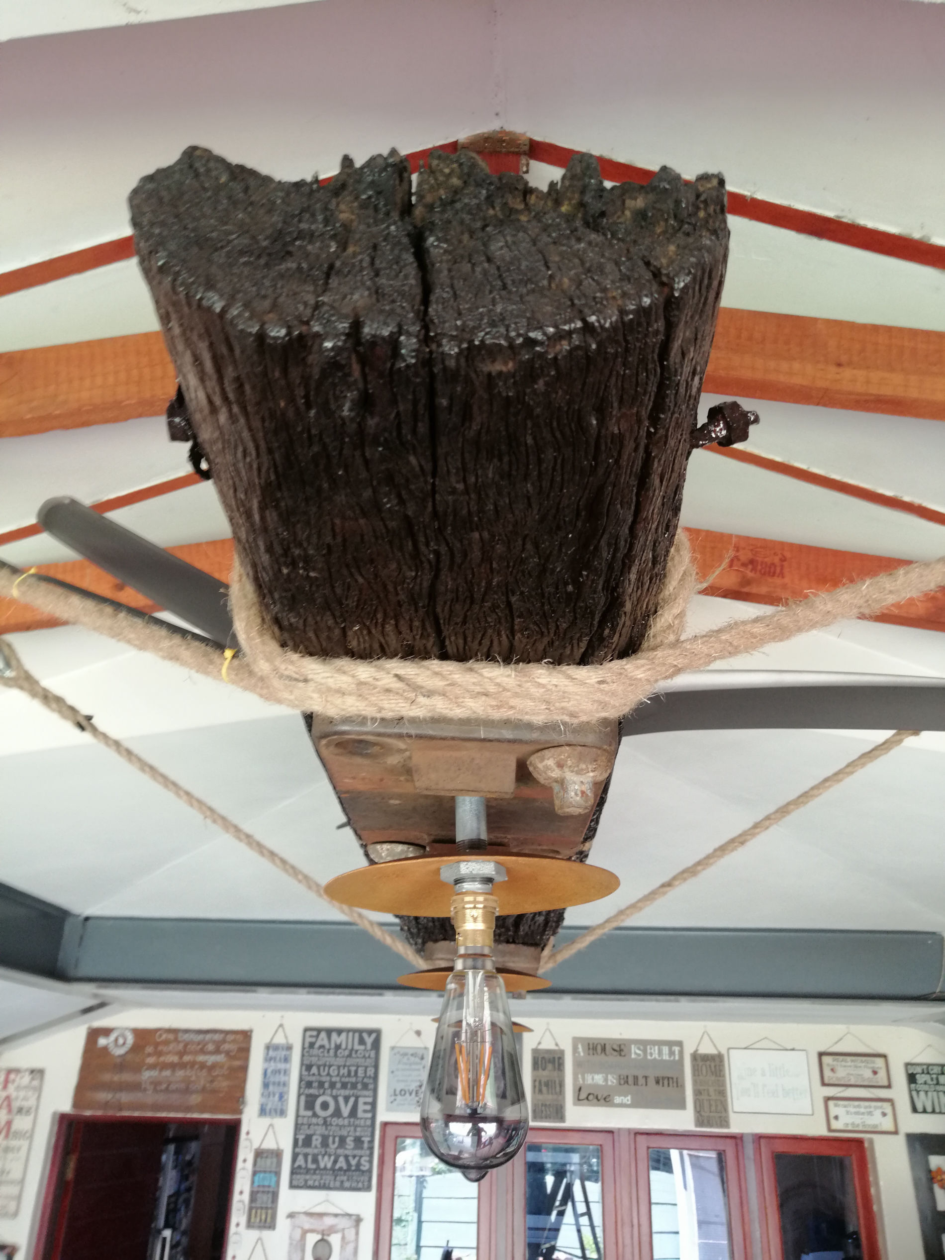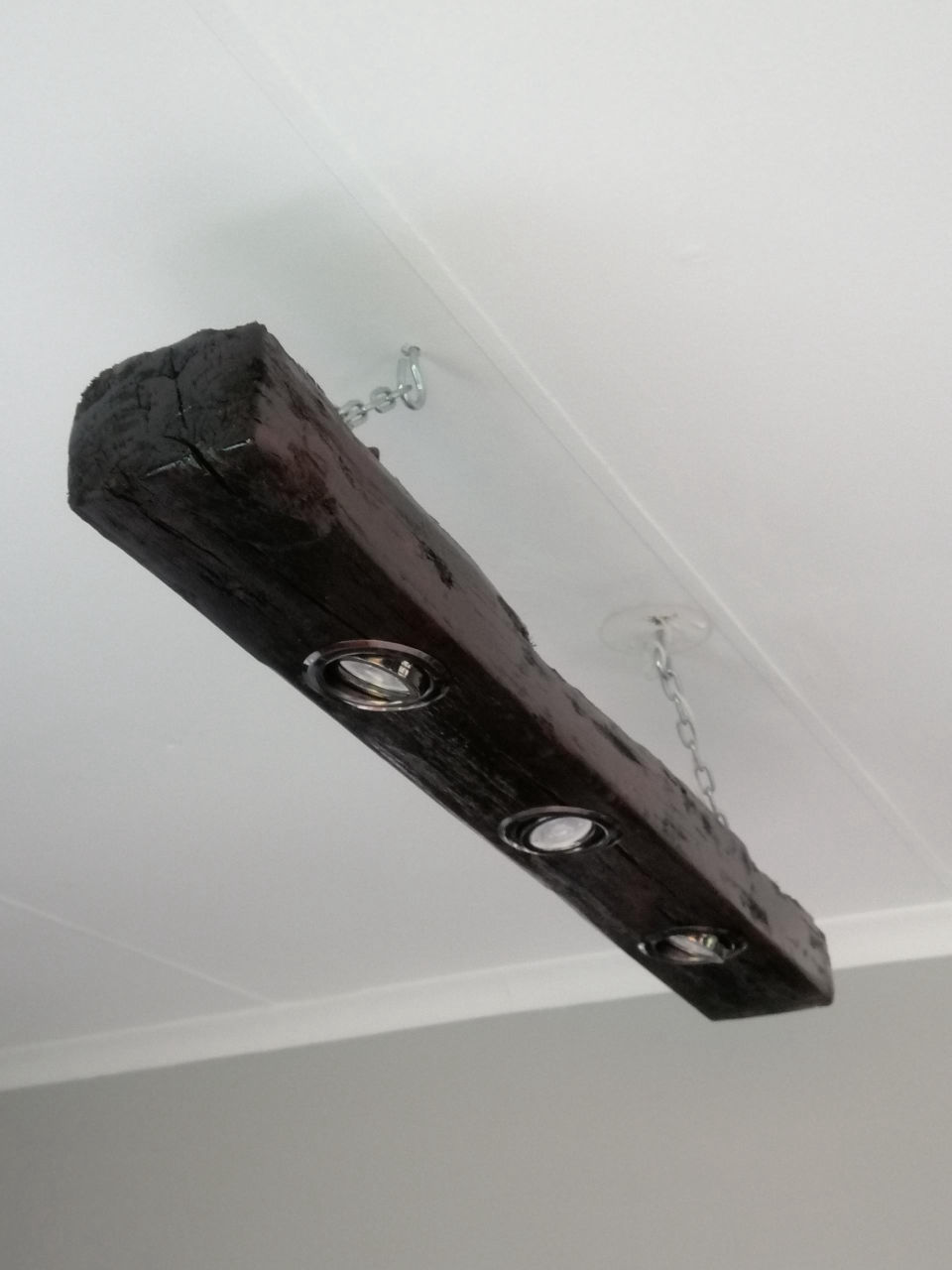 1.2m recovered mine sleeper fitted with downlight fittings. Light fittings, globe types, power supply and hanger type can be customised