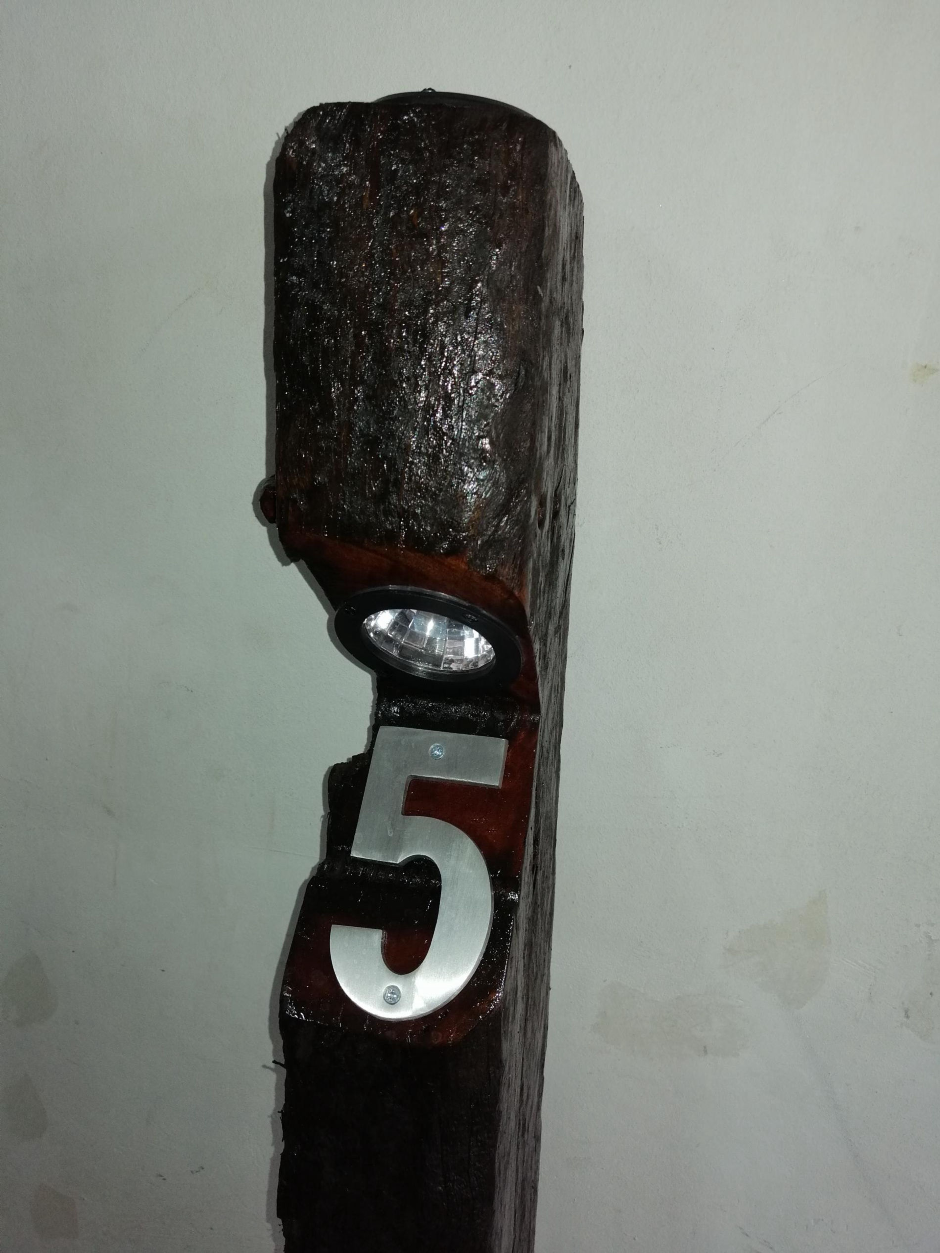 1.2m recovered mine sleeper with an angled cutout for the house number and light. Solar or 230V. Bronze or aluminium numbers can be selected.