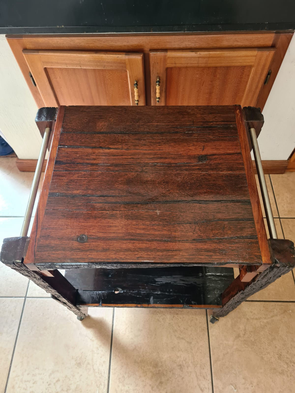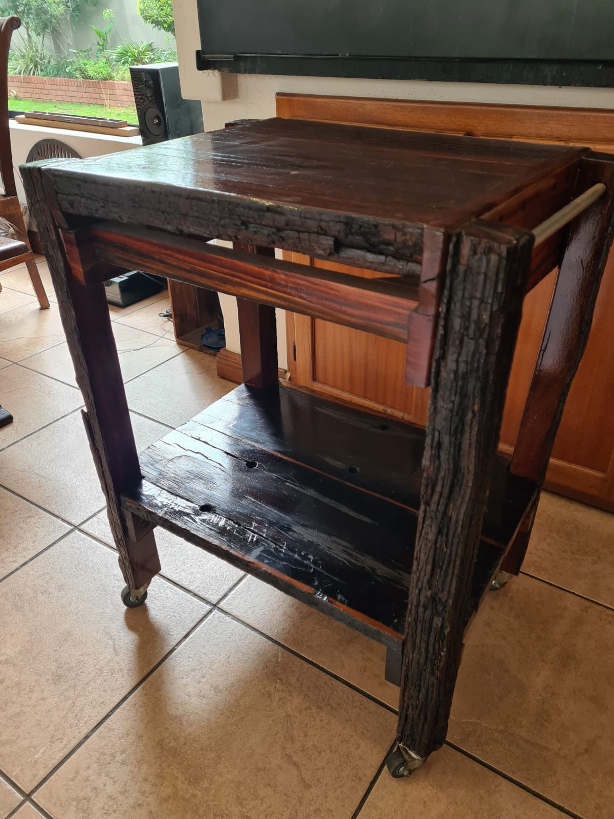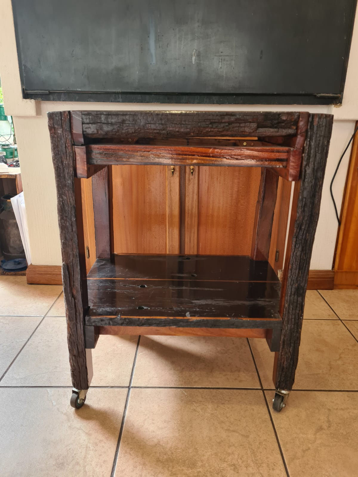 We were given a sleeper and asked to create a serving trolley based on a few hand sketches. The leg outside corners were left as they were cut from the sleeper with all the other surface finished off with a high gloss clear varnish.