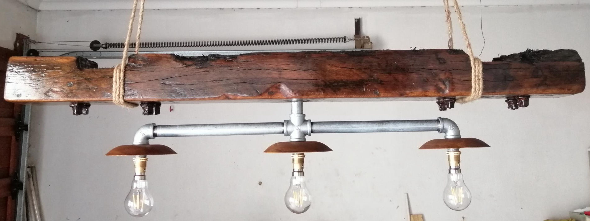 1.2m recovered mine sleeper with steam punk style light fittings. Chain or rope hangers available to choose from.