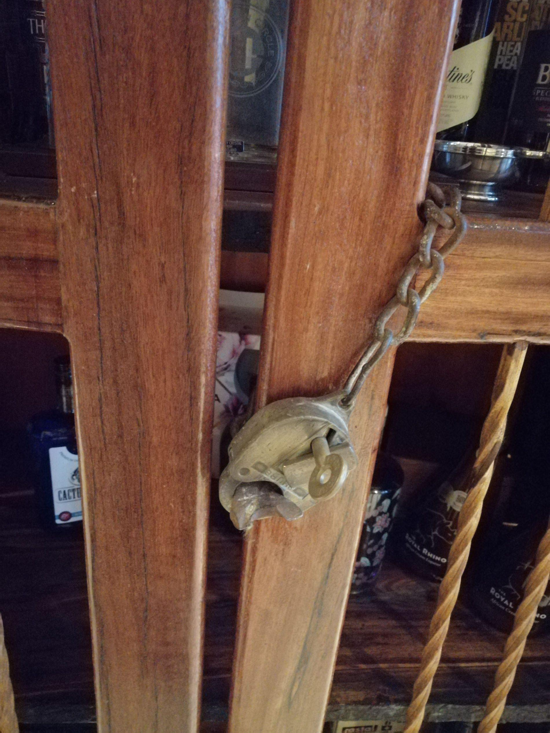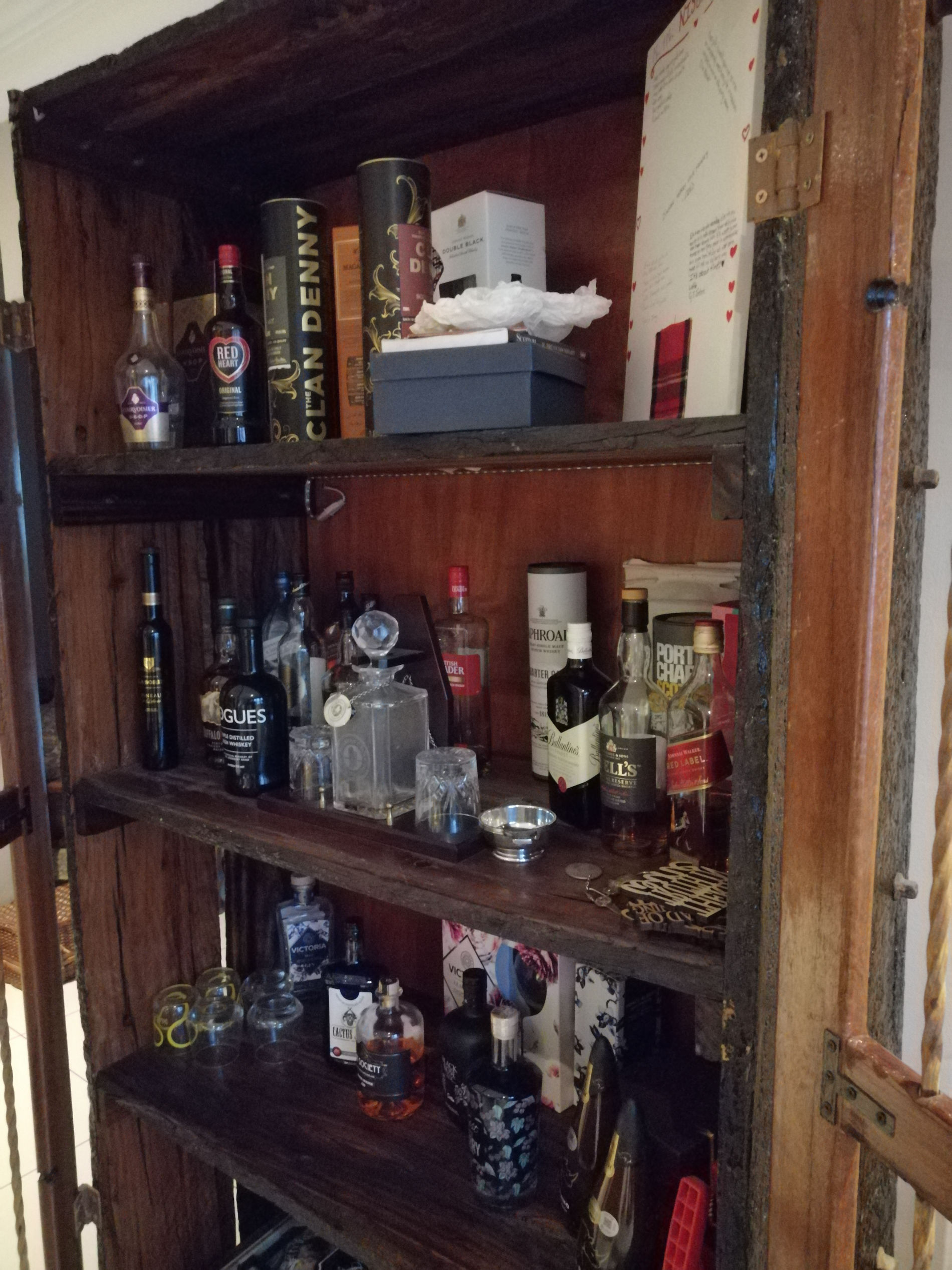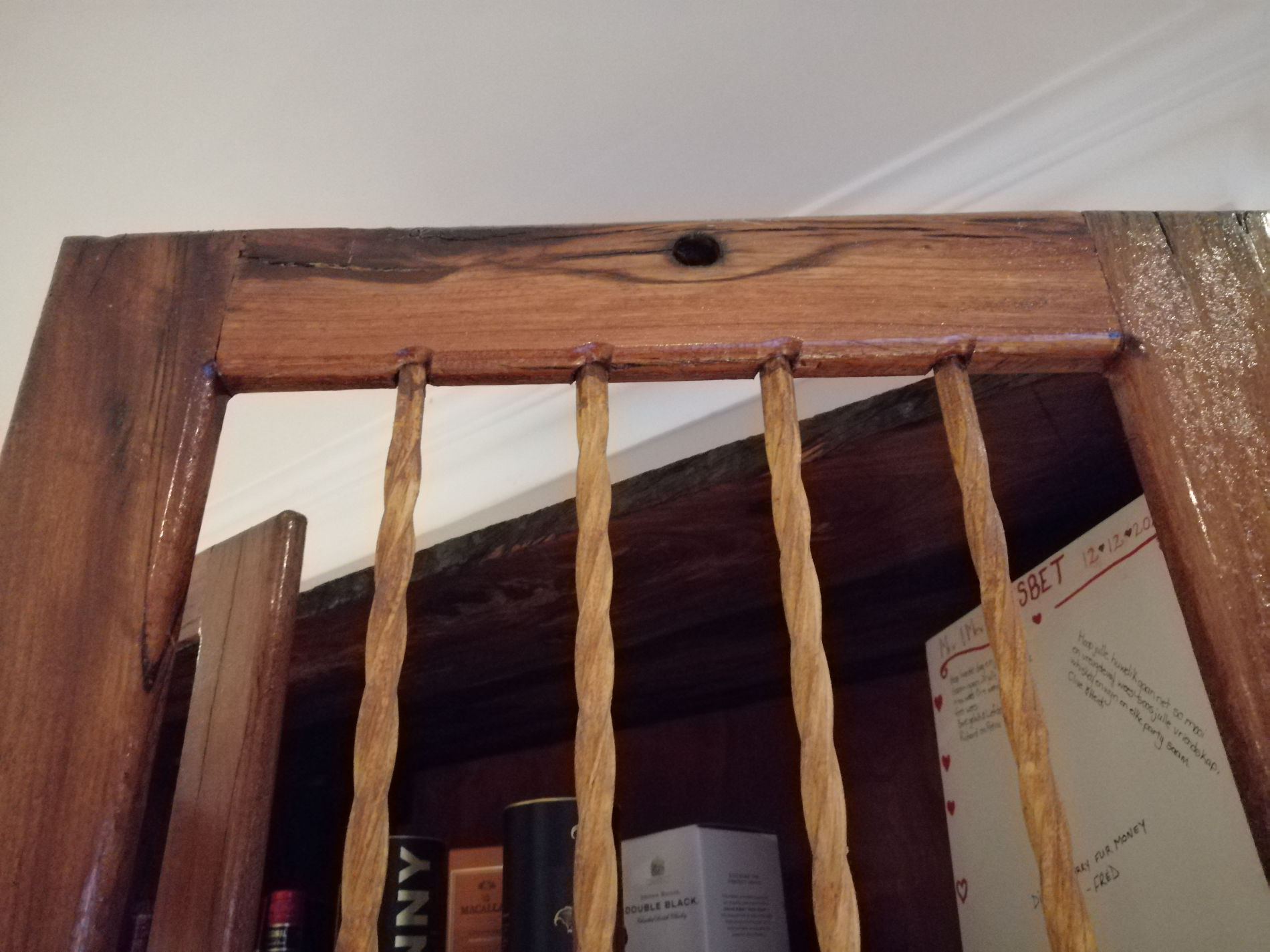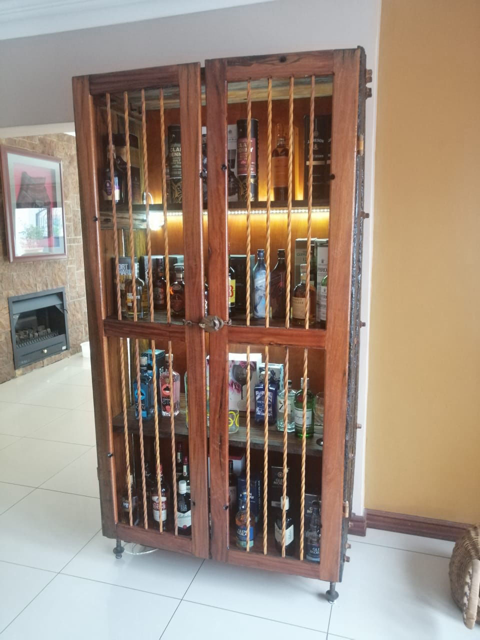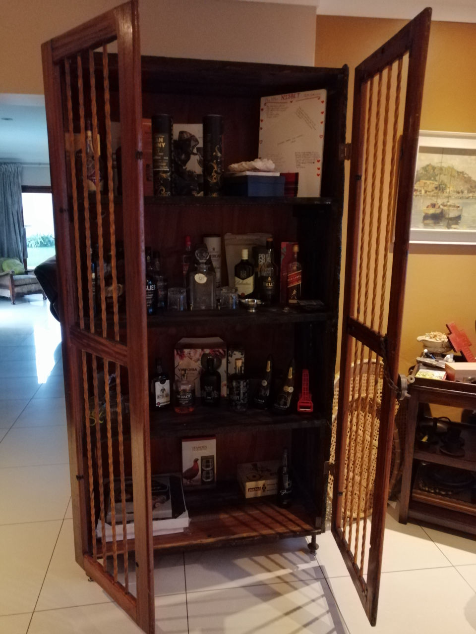 Sleeper wood planks were used to create this cabinet. The doors were crafted with twisted steel bars that are locked with an authentic SAS/SAR vintage lock and chain. LED strip lighting shows of the whisky collection and vibrant sleeper wood colouring.